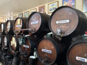 La bodega es, en sí misma, un recorrido por la memoria. Desde un gigantesco bocoy abierto, transformado en una pequeña sala donde cuelga la cédula que acredita la inscripción de la bodega con el número 1 en el registro de bodegas malagueñas, hasta lo verdaderamente esencial: las botas en las que se crían vinos que son auténticos emblemas de la casa. Allí reposan su magnífico pajarete, el único moscatel guinda, o el trasañejo Moscatel Isabel II, una verdadera joya de la corona que resume, en cada gota, el pasado y el presente de El Romerillo.