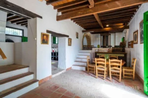 Unos metros más allá, el lagar se asoma al paisaje abierto de los Montes. Donde antes se pisaba la uva para extraer el mosto y dormían los jornaleros tras la faena, hoy se abre un salón amplio presidido por una enorme chimenea, pensado para recibir a los visitantes y para preparar arroces a la leña que saben a celebración. En la planta superior, el comedor ha sido cuidadosamente renovado, decorado con un estilo rústico y actual, sin perder la esencia del lugar.