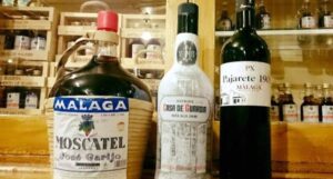 Completa la escena un colorista y multiforme ejército de garrafitas y botellas que escolta al visitante desde los tres grandes anaqueles colocados estratégicamente junto a las tres salidas del local, hacia la Alameda Principal, la calle Panaderos y la calle Pastora. En una de esas salidas hubo antaño un cartel tan expresivo como inolvidable, hoy, incomprensiblemente desaparecido, que ofrecía vinos preparados en pequeñas vasijas, pensadas para viajar en el equipaje de cualquier viajero de buen gusto que quisiera llevarse consigo un pedazo líquido de Málaga.